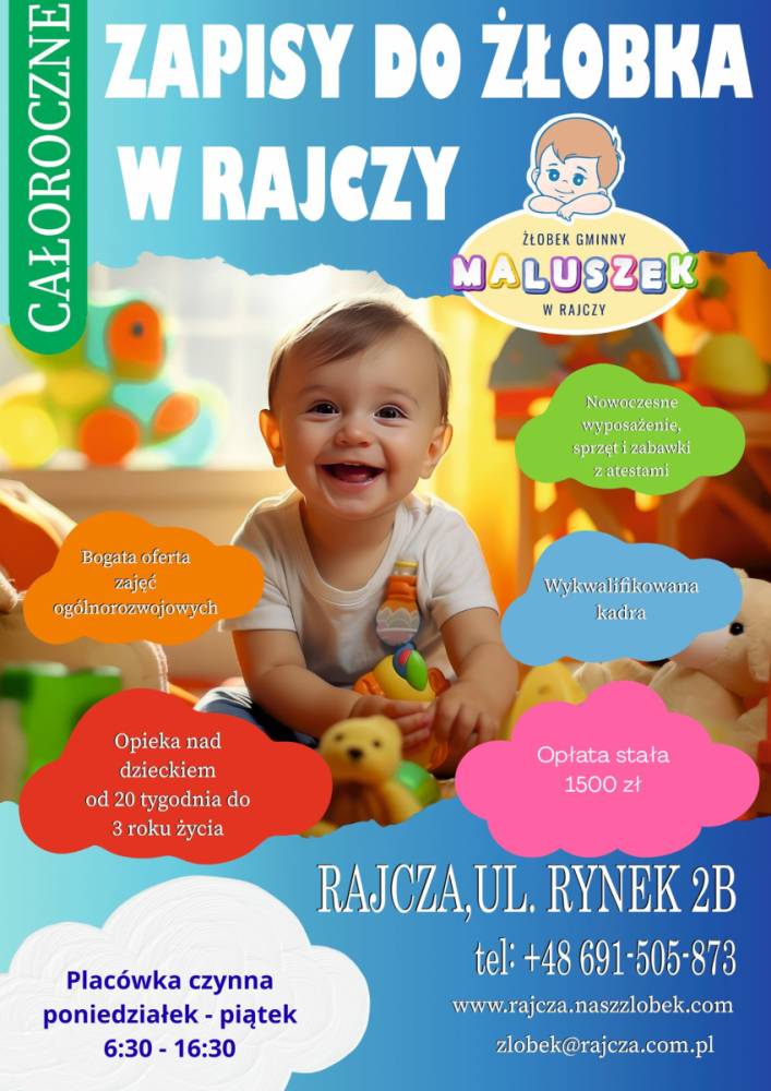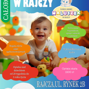 Rekrutacja dzieci do Żłobka Gminnego Maluszek w Rajczy odbywa się przez cały rok w miarę zwalniania się miejsc w placówce. Do żłobka przyjmowane są dzieci od ukończenia 20-tygodnia życia do 3 lat. Rekrutacja dotyczy dzieci mieszkające na terenie Gminy Rajcza jak i spoza gminy, jeżeli po zaspokojeniu potrzeb mieszkańców placówka dysponuje wolnymi miejscami. Dzieci zapisywane są do dwóch grup według zbliżonego wieku i rozwoju psychofizycznego.